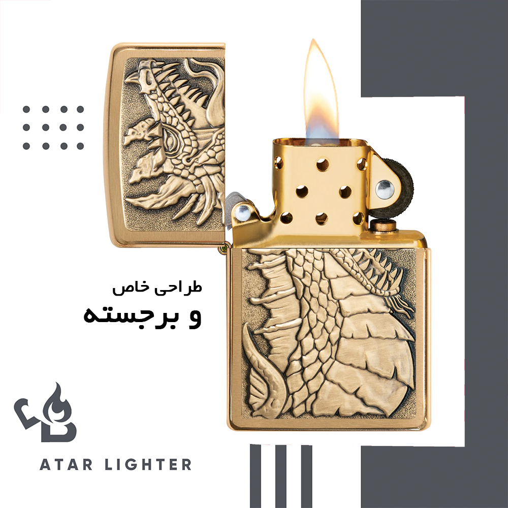 پلاک برجسته طرح اژدها بر بدنه فندک