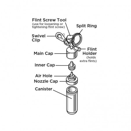 محفظه نگهداری سنگ یدک فندک-دارای آچار مخصوص باز کردن پیچ تعویض سنگ-دارای واشر اطمینان برای جلوگیری از نشتی بنزین.مناسب حمل و نقل در سفر و دارای حلقه جهت استفاده به عنوان جاکلیدی